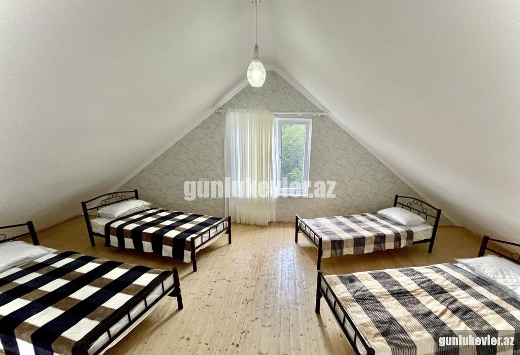 Zəng edərkən qalacağınız tarixləri və qonaq sayını mütləq qeyd edin !! Evlərə giriş saatı 14:00, çıxış saatı isə 12:00-dur. NS House - 9-10 nəfərlik,böyük həyəti olan,Dağ ətəyindəki Zaqatalanın Car kəndində çayın qırağında yerləşən 2 mərtəbəli piramida tipli evin: böyük salon-mətbəx(studiyası), 1 ci mərtəbədə 2 yataq otağı və sanuzel.,2 ci mərtəbəsi açıq yataq otağı. 1 yataq otağında 2 nəfərlik taxt. 1 yataq otağında 2 dənə 1 nəfərlik krovat 2 ci mərtəbədə 4 dənə 1 nəfərlik krovat. Salonda künc divan,açılan. Həyətində oturmağa ağacın altında stol və stullar,həyətin işıqlandırması vardır. Ətraflı şəkillərdən baxa bilərsiz. Əlavə məlumatlar:Qaz,Su,İnternet,Tv,Paltaryuyan,Kondisioner.,Samovar.,Manqal və s. Evin Günlük Qiyməti 130 azn. Ev 9-10 nəfərlikdir. Qiymətdə qalma müddəti və adam sayına baxıb, razılaşmaq olar. Vasitəçilik üçün Xidmət haqqı 20 AZN.